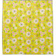 Bright and sunny throwback patterned shower curtain features white flowers with pink and green centers on yellow background.