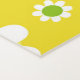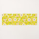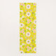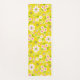 Yoga mat features retro white flowers with pink and green centres on yellow background.