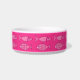 Mid-Century Modern, whimsical, retro fish pattern pet bowl, in shades of pastel to medium pink and fuchsia, on a medium fuchsia pink background