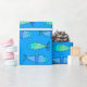 Mid-Century Modern, whimsical, retro fish pattern wrapping paper, in turquoise, aqua, lime green and sky blue, on a deep cerulean blue background