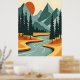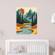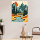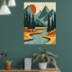 This stylish poster features a colourful and bold illustration of a retro mountain landscape in red, orange, and blue.