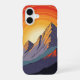 A warm retro-style art piece featuring glowing mountains beneath a soft sunset, designed with bold colors and a nostalgic aesthetic.