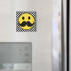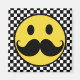 Retro funny yellow face custom handlebar moustache moustache on a chequerboard background.
