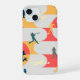 A vibrant, vintage-inspired phone case featuring a dynamic pattern of various sports silhouettes including baseball, soccer, and football. The mid-century modern geometric design in warm mustard yellow, terracotta red, and slate blue makes this the perfect accessory for athletes, coaches, and sports enthusiasts who love a retro aesthetic.