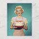 A cheerful mother with a 1950s vintage aesthetic, wearing a polka-dotted blouse and apron, smiles brightly while holding a beautifully decorated cake topped with strawberries and candles. The vibrant teal background enhances the retro vibe, evoking nostalgia and warmth. Perfect for themes of baking, motherhood, celebration, and retro style.