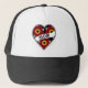 Personalise Mum tattoo trucker hat with retro flowers filled lace heart and a ribbon with the word MOM in the centre all in classic tattoo style. You can change the text to any Mother or a name on the mug. A great hat to give as a mothers day gift for the Mum your life.
