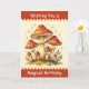 A birthday card with a picture of retro mushrooms in red and beige vintage colors. Inside is a whimsical poem and a cute frog holding a cupcake.