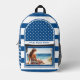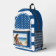 Navy blue and white backpack featuring a striped design with polka dots and your custom photo (optional; you can also leave the painting of the lady on the beach if you like). Beautiful for anyone who loves a nautical look or for a coastal holiday.
