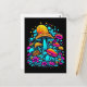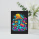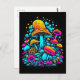 Colourful neon art with blue and pink mushrooms and flowers and a black background.