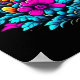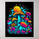 Colourful neon art with blue and pink mushrooms and flowers and a black background.