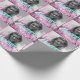 This custom gift wrapping paper features a retro 90s style Sweet 16 birthday theme. The background image is a sample black and white photo of a young girl, which you can replace with your own custom photo or image of your choice. The "Sweet Sixteen" title is printed at the bottom in teal and pink neon colours that resemble a vintage neon sign.