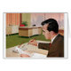 A vintage illustration of a retro office with a man, likely the boss, sitting at a desk signing paperwork. He's alone in the room, feeling full of himself and very self-important as he signs off on the urgent documents of the day. He smiles to himself and says, "I don’t know how to put this but, I’m kind of a big deal."