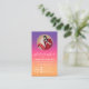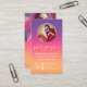Introducing a sleek and stylish retro photographer business card perfect for making a memorable impression. This card features a bold and modern design with a gradient ombre background transitioning from vibrant purple to warm orange sunset. The elegant, flowing script for "photographer" adds a personal touch, while the contact details and social media handles are clearly laid out in clean, modern fonts. A round photo template at the top. On the back you can add your photo work adding a professional touch. A QR code is prominently displayed for easy access to appointment scheduling, portfolio, and price list. This business card is ideal for wedding and fashion photographers looking to leave a lasting impression.