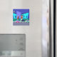 This Retro Open House Party Magnet will put you in the partying mood. The cartoon design features the exterior of a mid century modern house. Through the floor to ceiling turquoise glass walls, we can see the navy blue silhouettes of festive party goers. There is a couple chatting in front of a window. On the opposite side of the room, we can see a dancing man and the long-winded man everyone is trying to avoid. The exterior of the house features a cheery red door and an oversize purple brick chimney. A grey walkway is cutting a swath to the front door, through the teal grass. The nighttime scene has a dark blue sky with a yellow, crescent moon. An attractive couple is doing the cha-cha-cha on the way to their car. The blonde woman is wearing a bright red dress. Her handsome escort is wearing a black suit and a red tie. His hands are wrapped around the woman's waist. On the street, in front of the house, we can see three, brightly coloured classic cars. Order today and party like it's 1959!