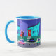 This Retro Open House Party Mug will put you in the partying mood. The cartoon design features the exterior of a mid century modern house. Through the floor to ceiling turquoise glass walls, we can see the navy blue silhouettes of festive party goers. There is a couple chatting in front of a window. On the opposite side of the room, we can see a dancing man and the long-winded man everyone is trying to avoid. The exterior of the house features a cheery red door and an oversize purple brick chimney. A grey walkway is cutting a swath to the front door, through the teal grass. The nighttime scene has a dark blue sky with a yellow, crescent moon. An attractive couple is doing the cha-cha-cha on the way to their car. The blonde woman is wearing a bright red dress. Her handsome escort is wearing a black suit and a red tie. His hands are wrapped around the woman's waist. On the street, in front of the house, we can see three, brightly coloured classic cars. Order today and party like it's 1959!