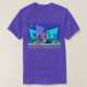 This Retro Open House Party T-Shirt will put you in the partying mood. The cartoon design features the exterior of a mid century modern house. Through the floor to ceiling turquoise glass walls, we can see the navy blue silhouettes of festive party goers. There is a couple chatting in front of a window. On the opposite side of the room, we can see a dancing man and the long-winded man everyone is trying to avoid. The exterior of the house features a cheery red door and an oversize purple brick chimney. A grey walkway is cutting a swath to the front door, through the teal grass. The nighttime scene has a dark blue sky with a yellow, crescent moon. An attractive couple is doing the cha-cha-cha on the way to their car. The blonde woman is wearing a bright red dress. Her handsome escort is wearing a black suit and a red tie. His hands are wrapped around the woman's waist. On the street, in front of the house, we can see three, brightly coloured classic cars. Order today and party like it's 1959!