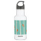 Personlaized water bottle with an illustration of birch trees with orange birds sitting on their branches. Retro green coloured background.