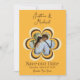 This custom Save the Date for the wedding announcement features a retro, 1970s inspired theme. The background is an orange colour, with brown text and the names of the couple printed in an elegant script font. A brown and yellow, 70s style flower is printed in the centre. A sample photo is placed inside the flower frame which can be personalised to include your own custom photo or other image.