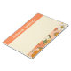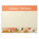 This large, 8.5x11 horizontal, 70’s inspired bright and cheerful personalizable stationery notepad features your name in a delicate, curly vintage font on a melon peach background with groovy retro orange floral illustration trim. The spacious writing area is a smooth vanilla colour.