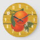 A retro kitchen wall clock with white and yellow numbers and vintage art of two ripe oranges on a branch with small white blossoms flowering against green leaves on a rustic faux wood background. Customise It to change background colours, sizing, add your name or message and more.