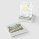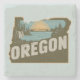 Stylish coaster features retro artistic Oregon state silhouette with text on light blue background