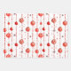 This wrapping paper features a repeating pattern of red and white Christmas ornaments hanging from vertical strings of red beads. There are also small, stylised red stars scattered throughout the white background. Some ornaments are solid red, while others have red and white stripes.