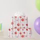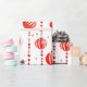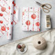 This wrapping paper features a repeating pattern of red and white Christmas ornaments hanging from vertical strings of red beads. There are also small, stylised red stars scattered throughout the white background. Some ornaments are solid red, while others have red and white stripes.