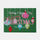 Retro Ornaments Green Christmas doormat has a vintage feel perfect for anyone that loves midcentury modern designs. There are seven hand painted retro ornaments above a starburst and atomic symbols pattern. The greeting says, Wishing Everyone a Very Merry Christmas, The Johnsons. You can personalise this with your own greeting, or keep it and just personalise with your family's name. This doormat is a non-slip rubber that won't crack or buckle, this mat resists fading, mould, and mildew and can be easily cleaned with a hose. This beautiful doormat is an excellent addition to any home to greet your guest during the holiday season.