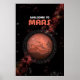 This retro style "Welcome to Mars" stylised space art poster depicts the red planet on a red nebula with stars and a thin grid of triangles on black background.