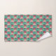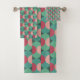 This towel set has a mid-century modern design of ovals with semi-circles inside them in retro Christmas colours.