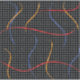 Retro 1980’s style primary colour paint strokes splatter pattern on a geometric black and white dotted background.