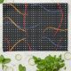 Retro 1980’s primary colour paint strokes spatter pattern on a geometric black and white dotted background.