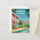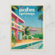 Vintage Art Deco style illustration featuring a pink and orange hotel with swimming pool against a bright blue sky with palm trees