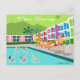 This Retro Palm Springs Hotel postcard is as fabulous as it is kitschy. Its garishly bright rainbow facade is dwarfed by the lime green mountains and spectacularly iconic palm trees. There's a party going on by the pool with bathing beauties and muscle men soaking up some vitamin D while watching the synchronised swimmers perform. It appears that only one of the swimmers knows the routine; the other four are out of sync. How embarrassing for them! The only thing that would make this design say “Palm Springs” more would be if it was written in the clouds. Oh, wait. It is!