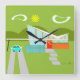 This Retro Palm Springs House with Car Square Wall Clock is a mid century modern lover’s dream. The minimalist art design features a sleek orange and glass house with a dramatically sloping checkmark shape roof. The red door offsets the orange stone planter filled with greenery and the decorative turquoise cinderblock privacy screen. Staggered concrete blocks form the perfect walkway through the lush, green lawn. A white carport offers shelter to a turquoise and white classic 1950’s car with fins. The car is perfect for driving around the green, rounded mountains in the distance. The kitschy 1960’s style house looks like a shady oasis from the hot, Palm Springs sun.