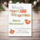 Cute and cheerful! This chic invitation style flat Christmas card features retro stylised text in various colours which says Wishing You Peace, Love, and Happiness. Colours include green, red, and pink tan. With the text is a matching tree bulb ornament and a red bird with a green winter scarf. Bright and colourful! The back of the card has a template for you to insert your own family photograph. *Clip art used in this design is copyrighted by Encore Software, Inc., which permits use to its licensors. All rights reserved.