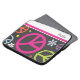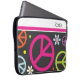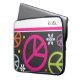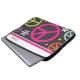 Retro peace signs in orange, green, pink blue and purple on a black background make this laptop sleeve a cool accessory to have .. perfect gift idea for woman or tweenw and teens.