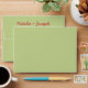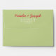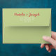 A retro modern hand written bright colourful wedding envelope. Which features bold bride and groom's names in red magenta colour. And personalised return address . On simple blush pale green vintage colour background. Which suits the whole wedding suite.