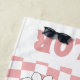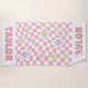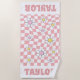 Multi Custom Colour and Font Style - personalised beach towel with name,groovy, daisies, and retro chequered background. Customise all colours as you wish! Cool idea for Bridesmaid gift!