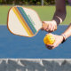 Create your own retro personalised pickleball paddle. Features abstract vintage stripes design and custom name in a classic style typography.