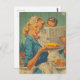 A cheerful 1950s housewife presents a delicious pie while her husband reads the newspaper, capturing classic mid-century Americana with vibrant vintage charm. Ideal for nostalgic greeting cards.