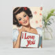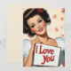 A vibrant illustration in classic 1950s pin-up style. The image features a glamourous woman with vintage curls, bold makeup, and a radiant smile. She holds a sign with a loving message, “I Love You,” set against a backdrop of delicate pink roses. The overall aesthetic captures the romantic and playful vibe of mid-century pin-up art.
