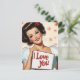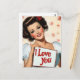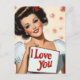 A vibrant illustration in classic 1950s pin-up style. The image features a glamourous woman with vintage curls, bold makeup, and a radiant smile. She holds a sign with a loving message, “I Love You,” set against a backdrop of delicate pink roses. The overall aesthetic captures the romantic and playful vibe of mid-century pin-up art.
