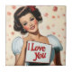 A vibrant illustration in classic 1950s pin-up style. The image features a glamourous woman with vintage curls, bold makeup, and a radiant smile. She holds a sign with a loving message, “I Love You,” set against a backdrop of delicate pink roses. The overall aesthetic captures the romantic and playful vibe of mid-century pin-up art.