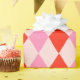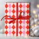 A bright, modern retro hand drawn diamond patterned holiday wrapping paper in shades of pink and red.