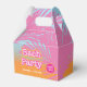 A cute pink theme design with "Bach Party" in a retro font. Pink palm trees art is in front of a cheerful blue and yellow sky inspired by a California beach. The name of the bachelorette and wedding date are underneath. Text is identical on both sides of the favour box.