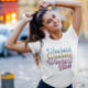 Cute retro font with colours of pink blue and yellow on t shirt for women. Quote "weekend vibes" on the shirt.