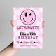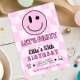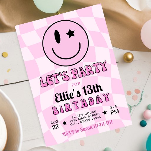 Step back in time to Y2K with our Retro Pink Happy Face Birthday Invitation! This fun and nostalgic invitation feature a pink chequered background that sets the perfect retro vibe. The centerpiece is a cute winking happy face that adds a playful touch to the design. Surrounding the happy face are stars and retro font that complete the look. Customise the details to make it uniquely yours and set the tone for celebration full of good vibes!
