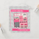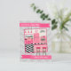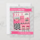 A cooking party invitation featuring an illustration on front of a retro inspired pink kitchen decorated with black and white floor. Personalise the text on front and back. Background is light grey with zig zags.
