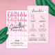 Give this facial aftercare instructions card to your clients and be sure they know how to take care of their skin after a salon facial treatment. This aesthetician care card includes care icons for each step and features a modern pink design with retro fonts and space for your beauty salon details. Use this facial care cards for any type of facial, you can customise the text to suit your needs.